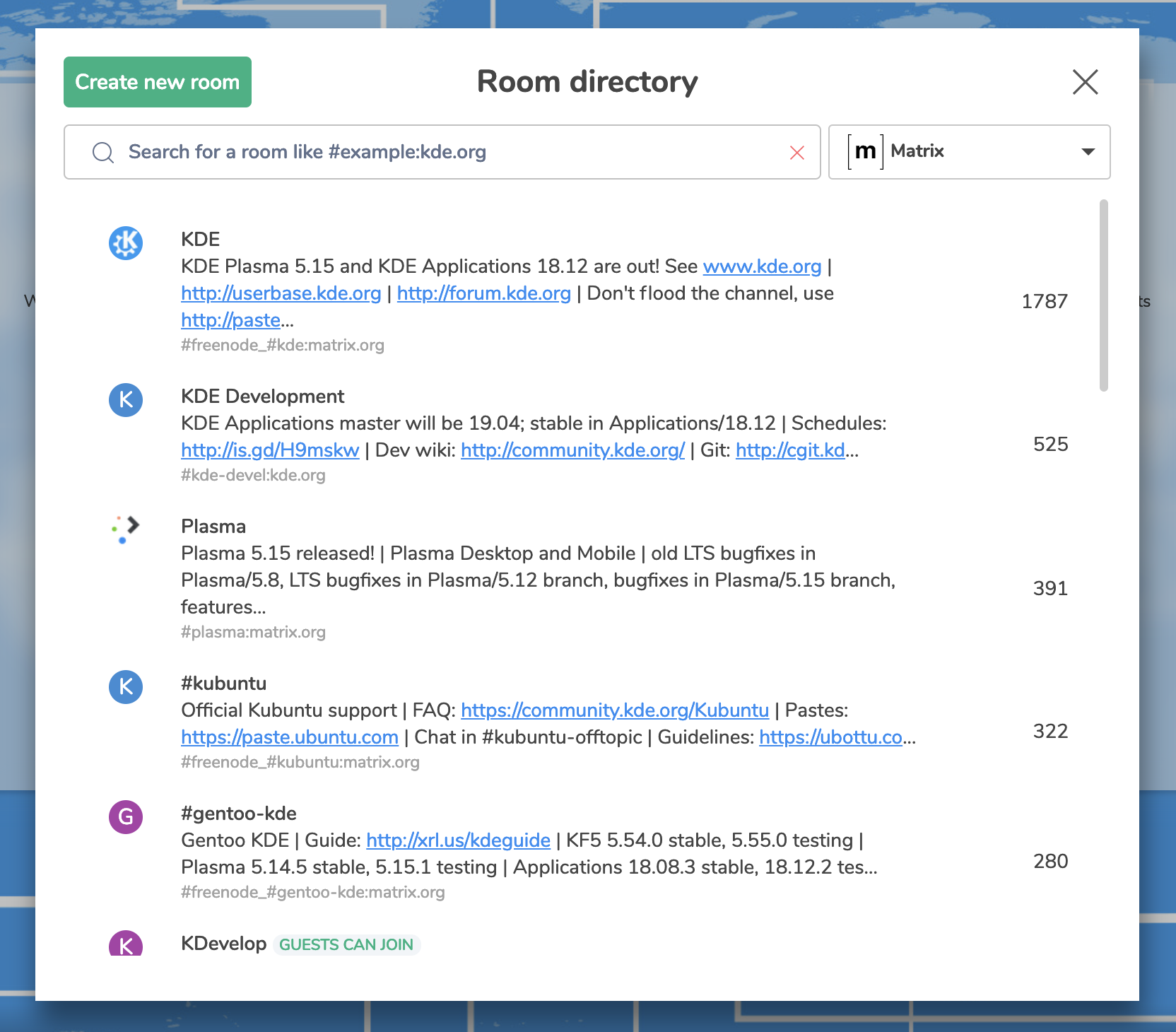 This doesn't change the KDE rooms which exist in Matrix today or indeed the KDE Freenode IRC channels - so many of the KDE community were already using Matrix, all the rooms already exist and are already bridged to the right places. All it means is that there's now a shiny new homeserver (powered by Modular.im) on which KDE folk are welcome to grab an account if they want, rather than sharing the rather overloaded public matrix.org homeserver. The rooms have been set up on the server to match their equivalent IRC channels - for instance, #kde:kde.org is the same as #kde on Freenode; #kde-devel:kde.org is the same as #kde-devel etc. The rooms continue to retain their other aliases (#kde:matrix.org, #freenode_#kde:matrix.org etc) as before.