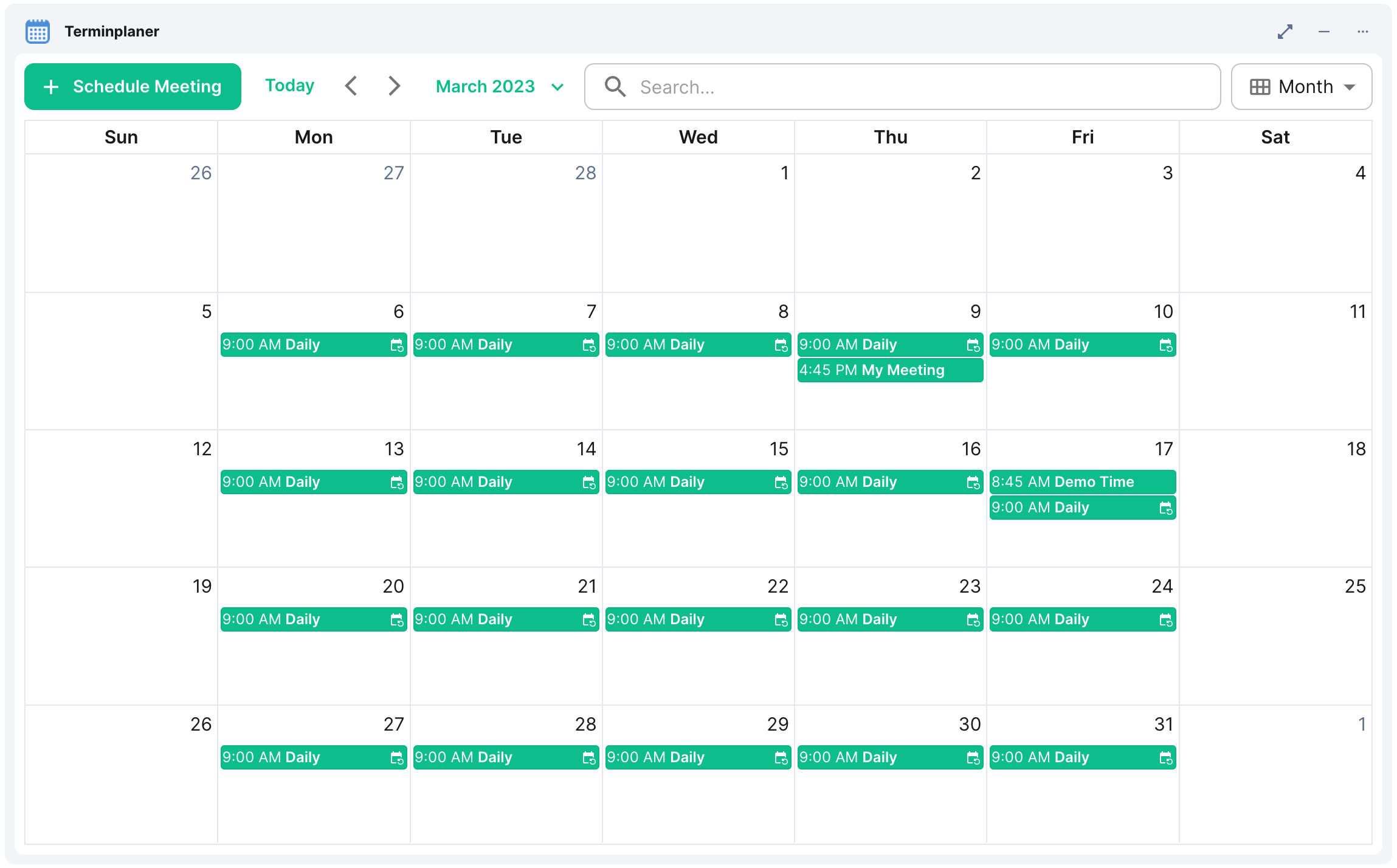 Entering the matrix-meetings-widget! The widget allows to plan meetings, invite other users, configure meetings rooms, view your calendar, and perform video conferences. All data is stored in Matrix, no external service required. As the Widget API is a bit limited for this use-cases, it's a combination of a widget and a bot.